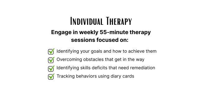 DBT includes 4 modes of treatment: individual therapy, skills training, skills coaching, and therapist consultation.